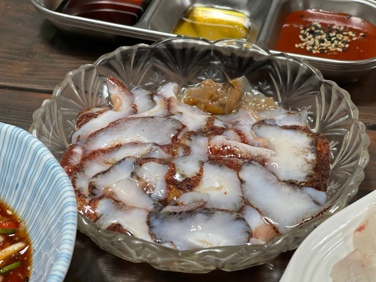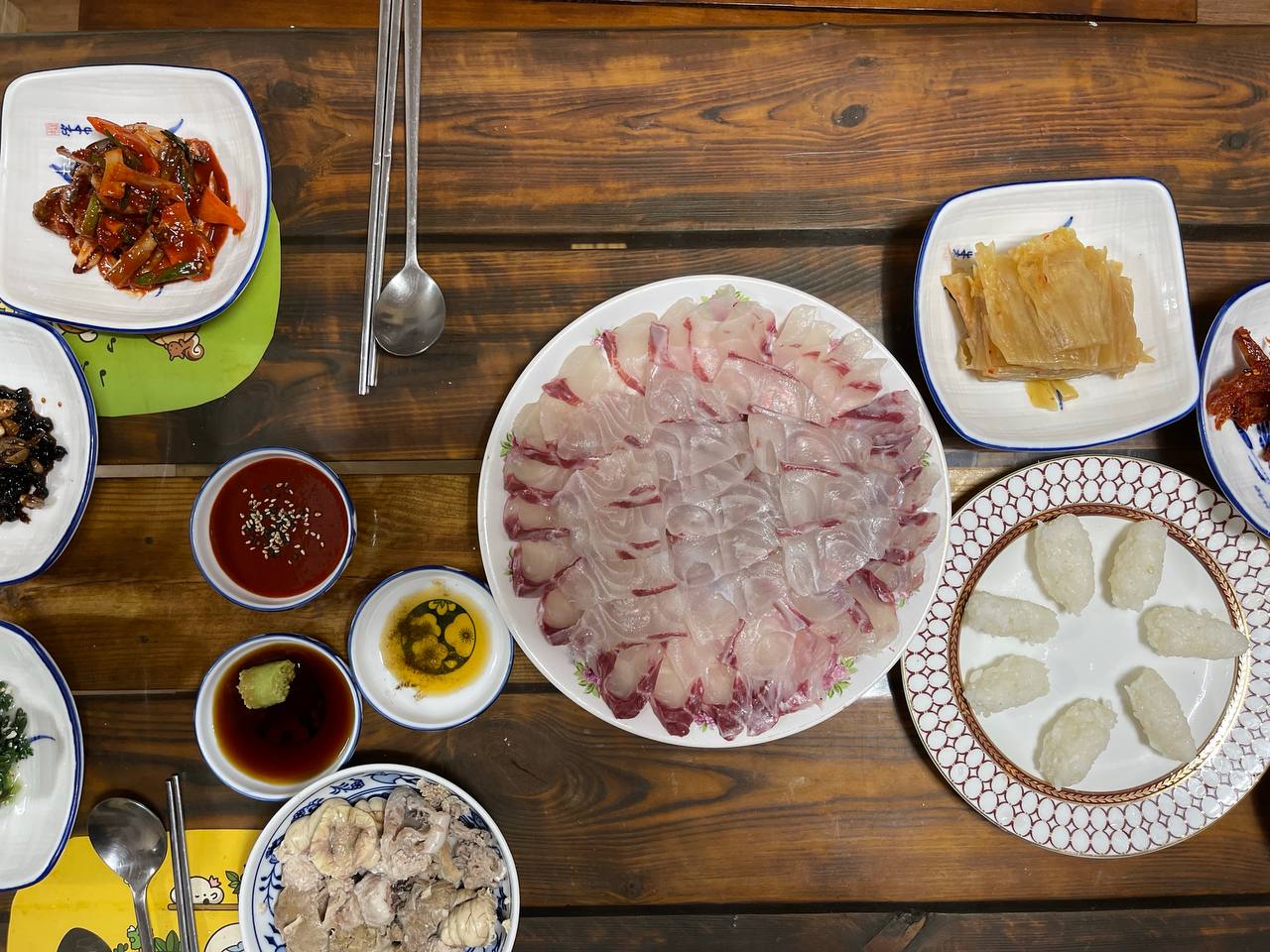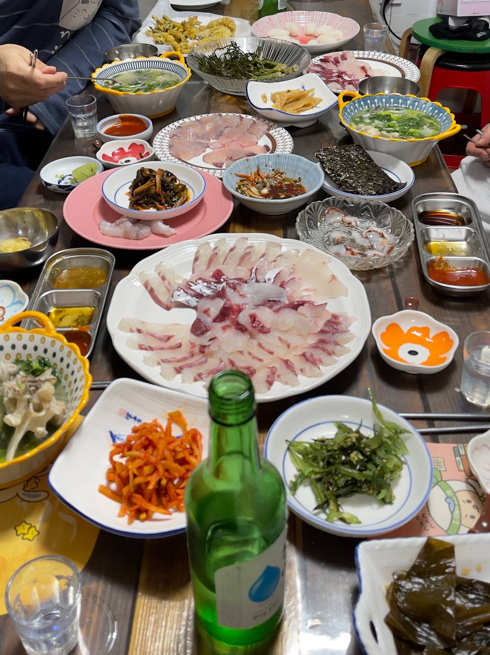 사장님이 감성돔을 가져가지 않겠냐고 몇번을 물어보셨는데 차를 가져온게 아니고 비행기를 타고온데다 살려 가기엔 품이 너무 들어가서 그냥 먹겠다고 해서 다같이 푸짐한 저녁상을 들었다.