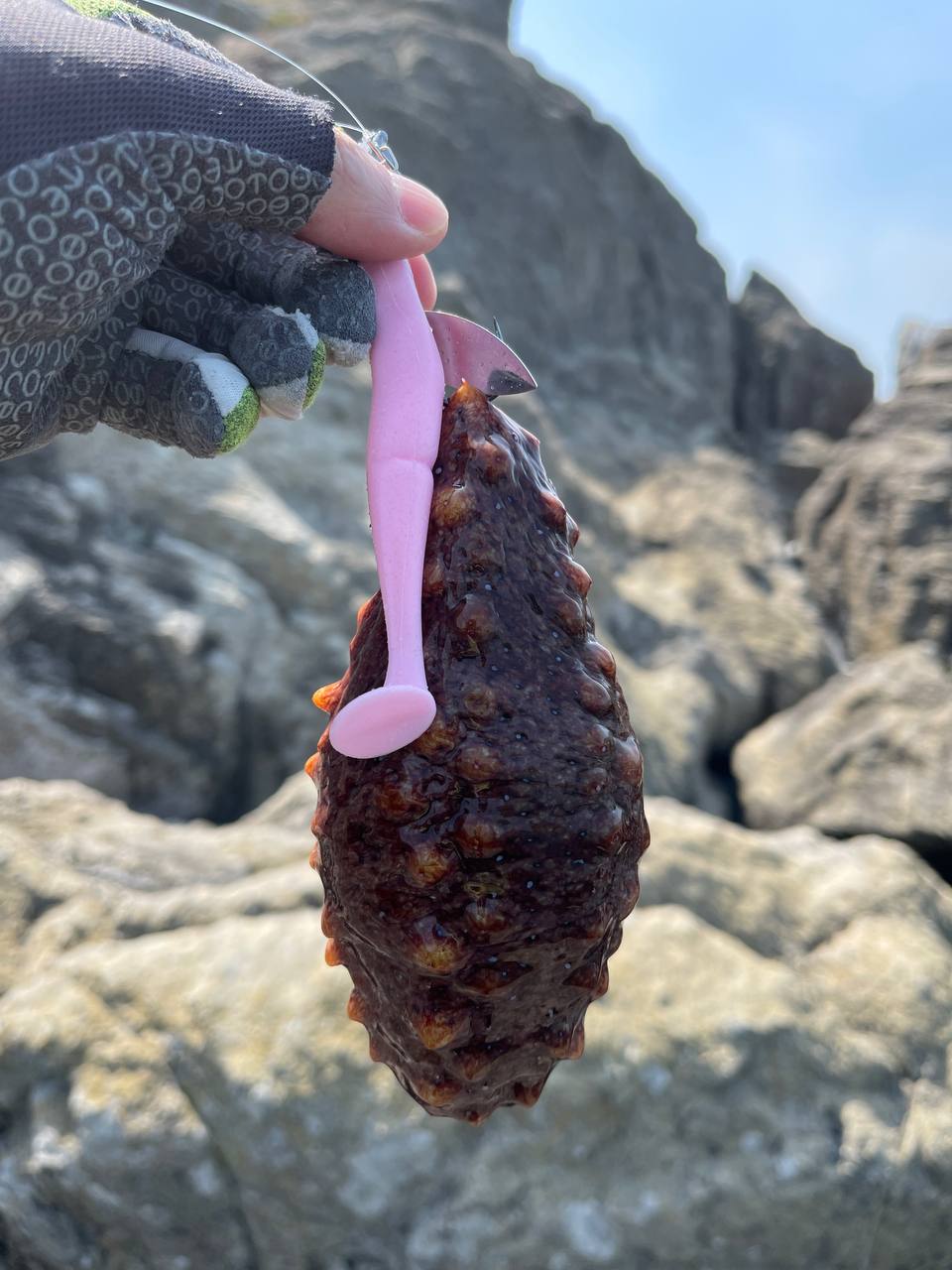 큼지막한 홍해삼이 지그헤드 훅에 주둥이를 정확하게 꿰어서 나온다.